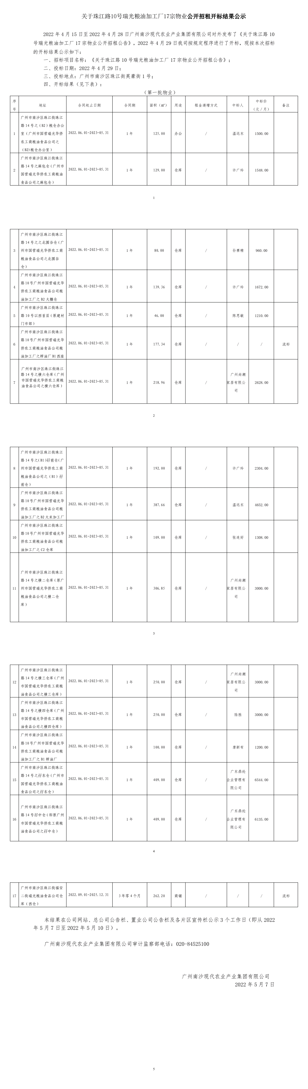 關(guān)于珠江路10號(hào)瑞光糧油加工廠17宗物業(yè) 公開招租 開標(biāo)結(jié)果公示