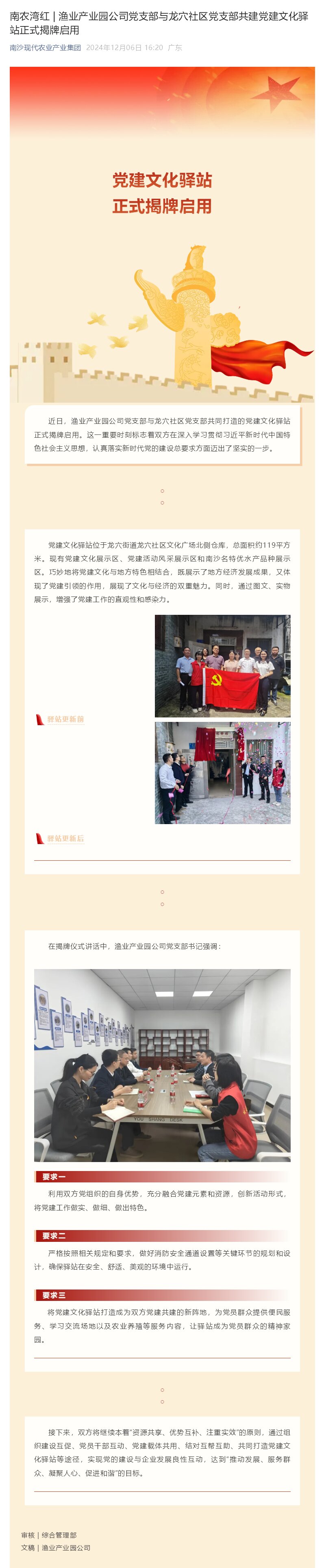 漁業(yè)產(chǎn)業(yè)園公司黨支部與龍穴社區(qū)黨支部共建黨建文化驛站正式揭牌啟用